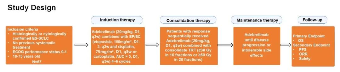 于金明院士:免疫治疗的蓬勃发展给ES-SCLC患者带来新希望,化疗联合免疫治疗已成为ES-SCLC的一线治疗方案。IMpower133研究首次证实PD-L1抑制剂联合化疗可以显著改善ES-SCLC的生存,致使ES-SCLC的生存首次超过了1年,随后CASPIAN研究进一步验证了PD-L1抑制剂联合化疗在ES-SCLC中的疗效,但是两项研究中纳入亚裔患者比例非常有限。国内首个自主研发的PD-L1抑制剂阿得贝利单抗的上市,把中国ES-SCLC患者中位总生存期(mOS)带到了15个月以上。其III期临床研究CAPSTONE-1在国际顶级期刊《柳叶刀·肿瘤学》上发表,首次在中国ES-SCLC患者中验证了PD-L1抑制剂的卓越疗效。虽然免疫联合化疗一线治疗为ES-SCLC患者带来了长期生存的希望,但如何进一步提升疗效、扩大免疫治疗获益人群成为不断探索的新方向。放疗与免疫治疗在机制上有着良好的协同作用,在ES-SCLC免疫联合化疗的标准治疗基础上进一步联合放疗能否协同增效值得进一步探索!我们中心在开展阿得贝利单抗联合化疗序贯胸部放疗一线治疗ES-SCLC的II期研究前,曾从分子层面鉴定出了SCLC新的衰老相关亚型,且发现这一类型的ES-SCLC在放疗的介入下通过上调PD-L1的表达来介导免疫微环境的改变。因此,我们开展了这项临床试验来探索阿得贝利单抗联合化疗序贯胸部放疗一线治疗ES-SCLC患者的有效性和安全性。