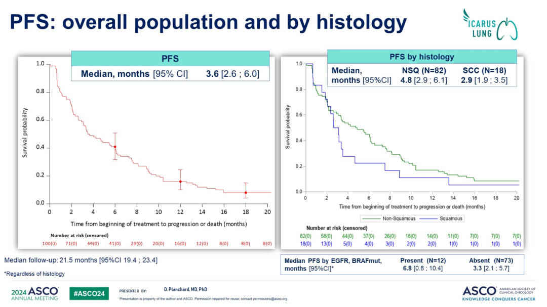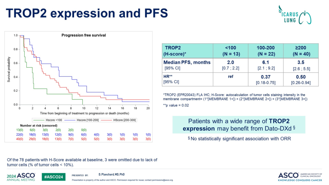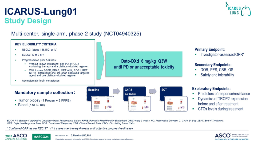 [1]David Pl,Nathalie C,Marie W,et al.ICARUS-LUNG01:A phase 2 study of datopotomab deruxtecan(Dato-DXd)in patients with previously treated advanced non-small cell lung cancer(NSCLC),with sequential tissue biopsies and biomarkers analysis to predict treatment outcome.2024 ASCO.Abstract 8501.
