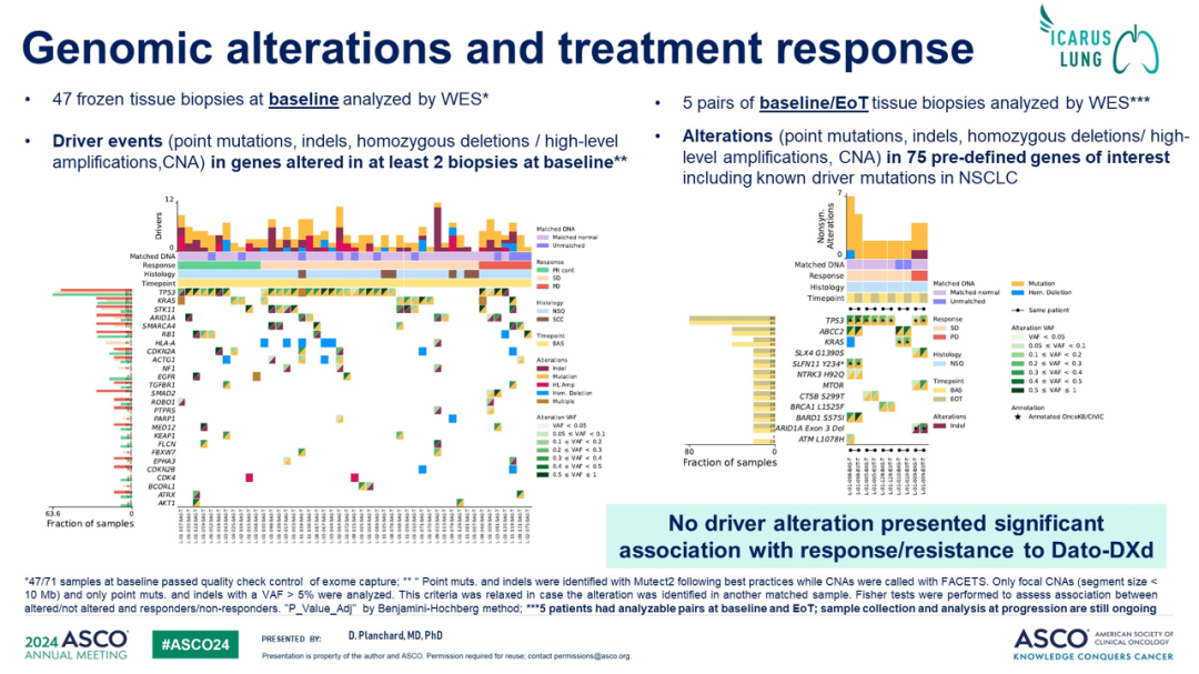 测序分析提示无驱动基因突变与Dato-DXd的药物反应性之间有显著关联。这一结果与ESMO ASIA公布的“伴有AGA的NSCLC患者接受Dato-DXd治疗后mPFS更获益”存在出入,不除外样本量过少及检测手段不同导致的数据差异。