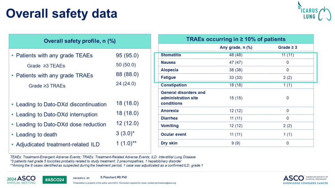 安全性方面,与既往TROPION系列研究相比未出现新增的严重不良事件。≥3级治疗相关的不良事件(TRAEs)发生率为24.0%,最常见的TRAEs依然是口腔炎(48.0%)和恶心(47.0%)。总而言之,Dato-DXd耐受性良好,安全性可控。